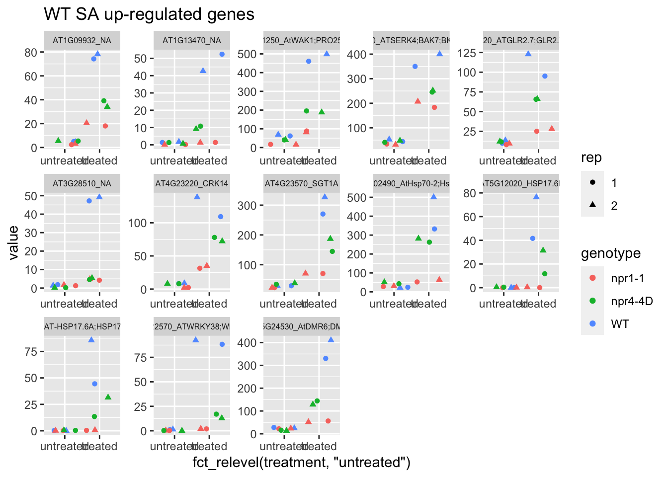 p1<-plot.data %>% filter(logFC>0 & FDR<1e-100) %>% dplyr::select(-logFC,-logCPM,-FDR,-full_name) %>% gather(Run,value,-1) %>% left_join(sample.info.final,by="Run") %>% select(-Run,-sample,-group,-LibraryLayout) %>% ggplot(aes(x=fct_relevel(treatment,"untreated"),y=value,color=genotype,shape=rep)) + geom_jitter() + facet_wrap(AGI_desc~.,scale="free",ncol=5,labeller = label_wrap_gen(width=30))+theme(strip.text = element_text(size=6)) + labs(title="WT SA up-regulated genes")