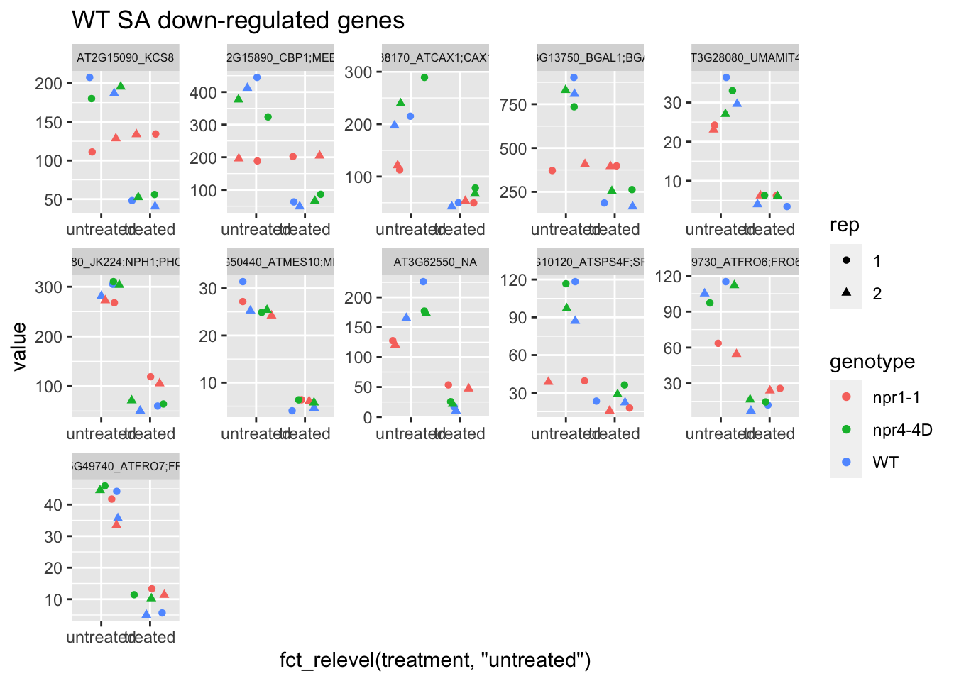 p2<-plot.data2 %>% filter(logFC<0 & FDR<1e-50) %>% dplyr::select(-logFC,-logCPM,-FDR,-full_name) %>% gather(Run,value,-1) %>% left_join(sample.info.final,by="Run") %>% select(-Run,-sample,-group,-LibraryLayout) %>% ggplot(aes(x=fct_relevel(treatment,"untreated"),y=value,color=genotype,shape=rep)) + geom_jitter() + facet_wrap(AGI_desc~.,scale="free",ncol=5,labeller = label_wrap_gen(width=30))+theme(strip.text = element_text(size=6)) + labs(title="WT SA down-regulated genes")