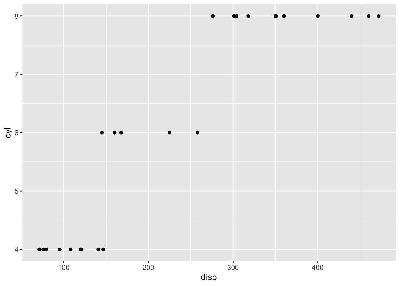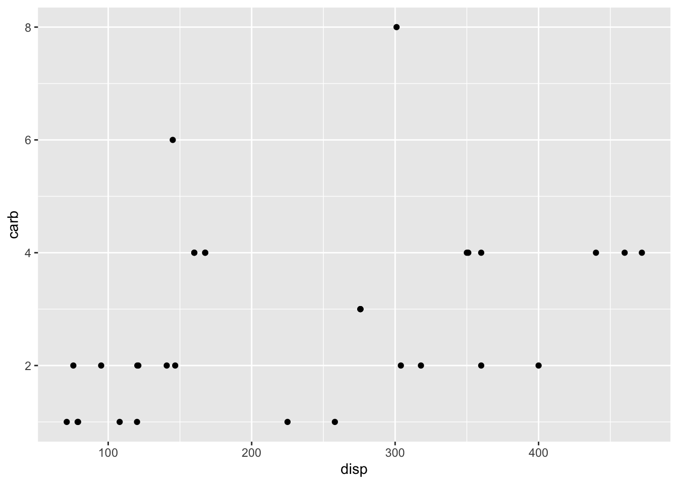 plot.list <- tibble(parameters=names(mtcars)) %>% split(.$parameters) %>% map(~scatter_by2(mtcars, disp, as.name(.$parameters)))